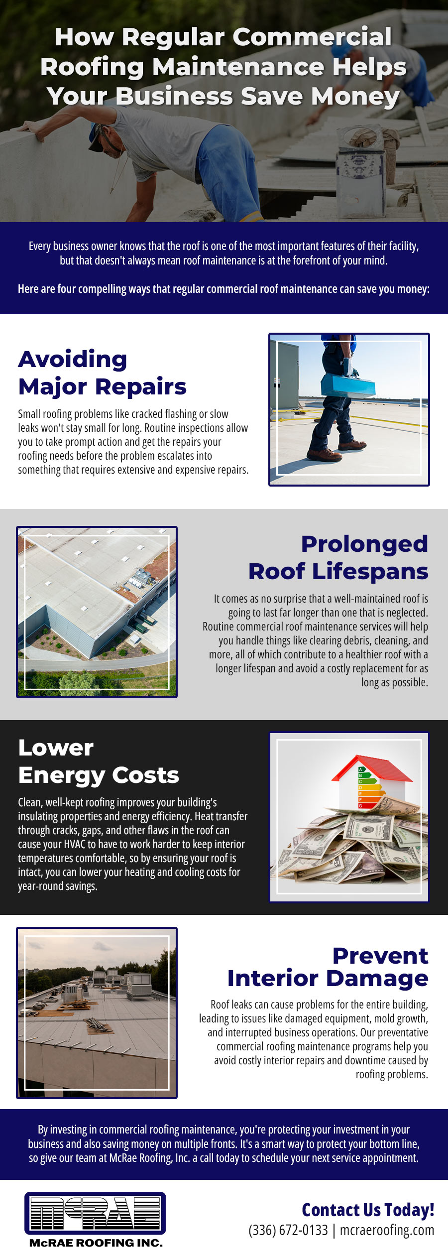 At McRae Roofing, Inc., we know that your business is important to you, and we want to help you keep it running smoothly. A key part of running any business is keeping your facilities in good shape, and our team can help you take care of your building’s roof. We have extensive experience in the roofing industry—with some of our team members having been working in this field for more than 50 years—and we offer a comprehensive range of commercial roofing services to keep your roof in the best possible condition.